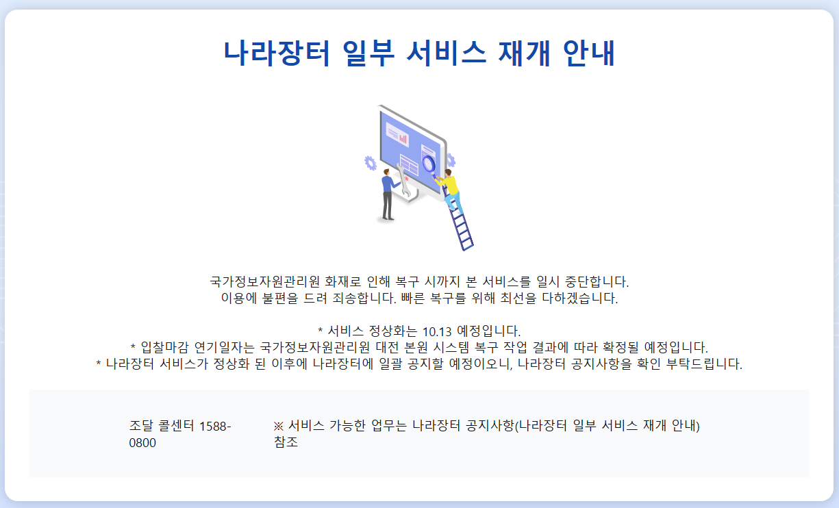 아래와 같이 현재 국가정보자원관리원 화재로 인해 누리장터 홈페이지가 복구중이며