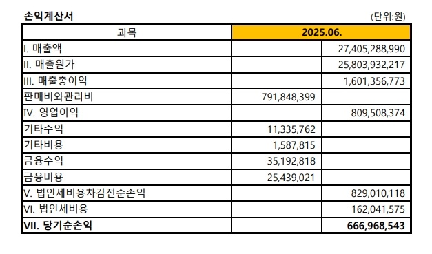 코가스서비스얼라이언스(주) 2025년 상반기 결산 손익계산서