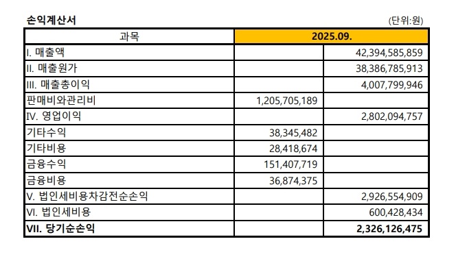 코가스서비스얼라이언스(주) 2025년 3분기 결산 손익계산서
