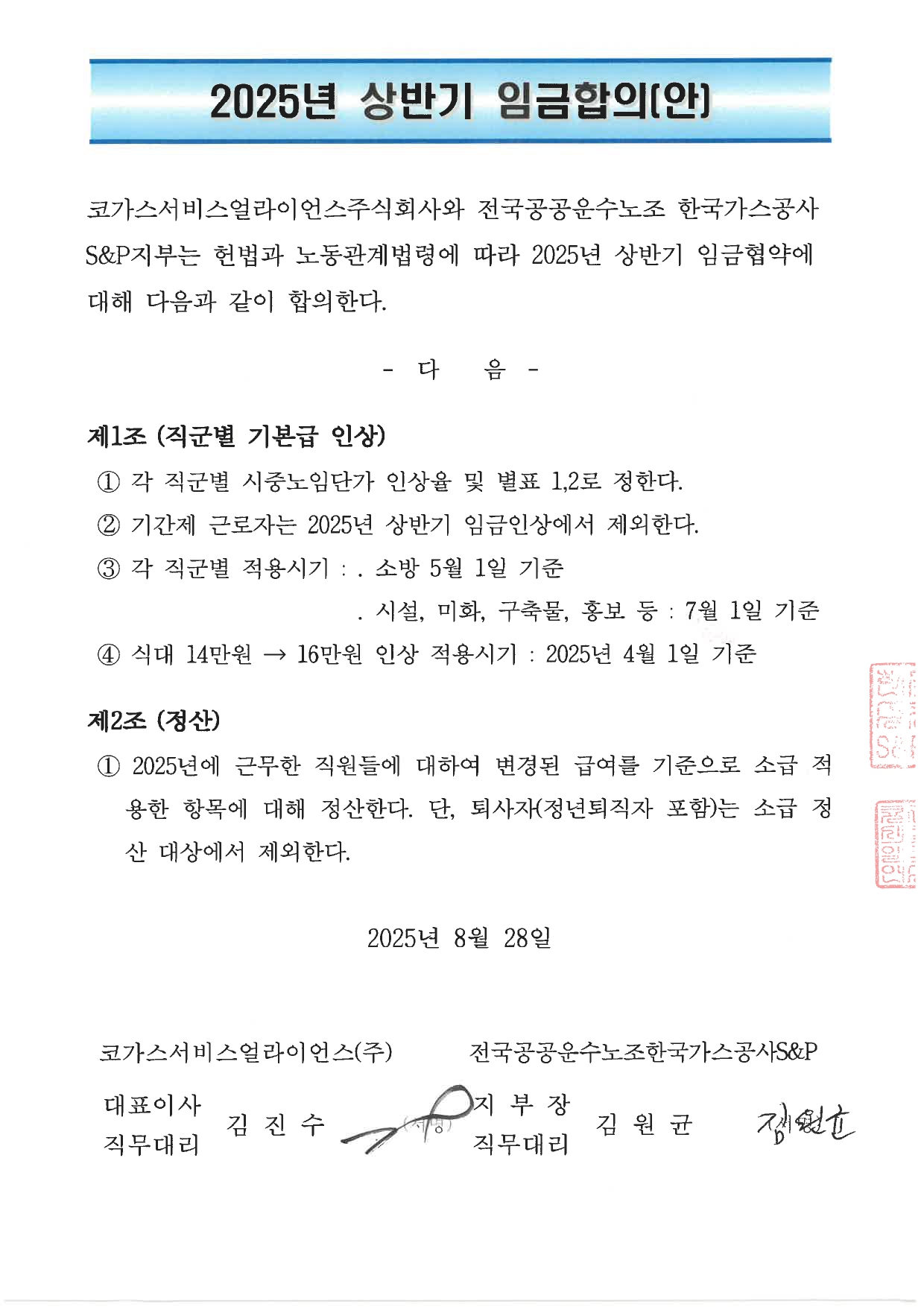 코가스서비스얼라이언스(주) 2025년 상반기 임금협약식