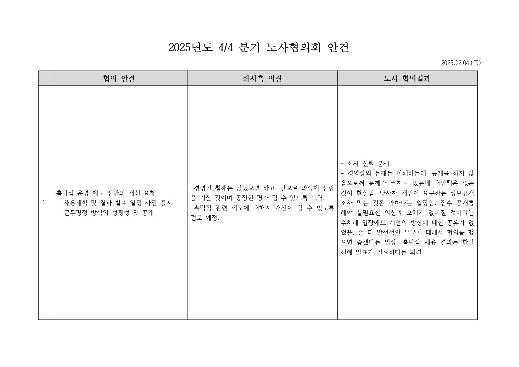 . 공시내용: 2025년 4/4분기 노사협의회 결과